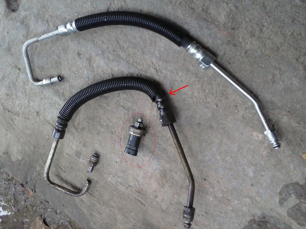 Selang lama dan baru. Tanda panah adalah posisi kebocoran dan yang dilingkari adalah sensor tekanan minyak power steering. Terlihat juga potongan pipa bagian bawah hasil karya saya.