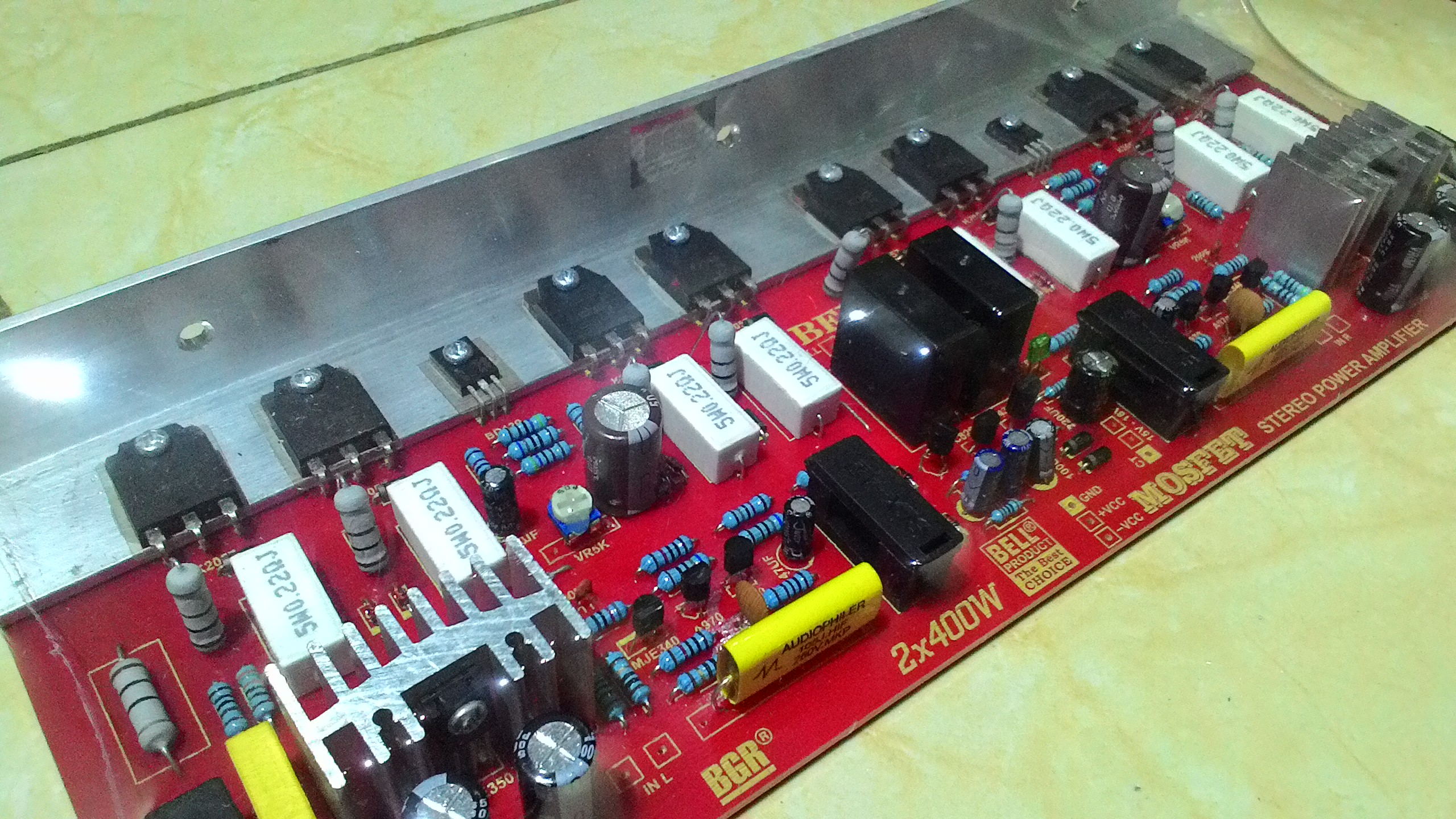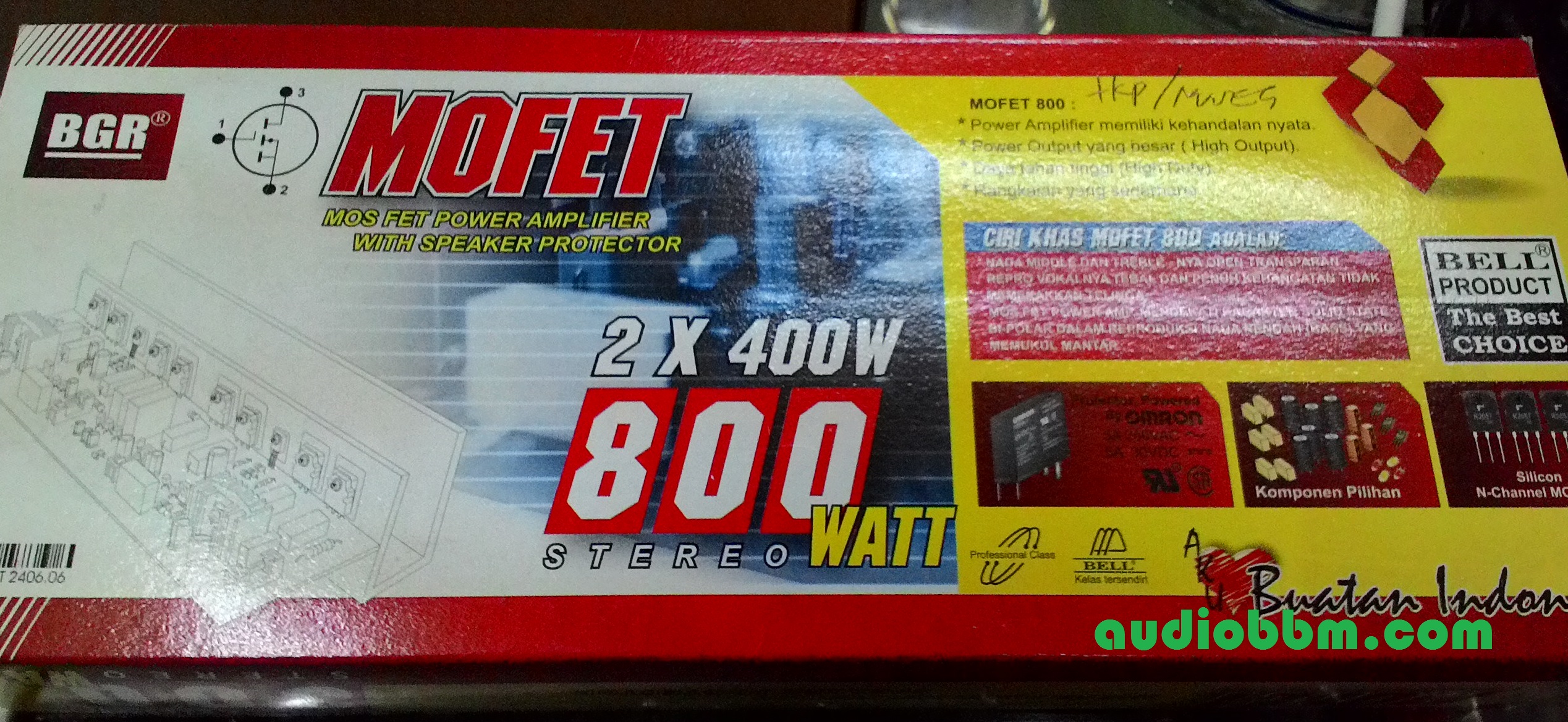 Bell BGR Mofet 800. Heavy duty Stereo Mosfet Amplifier, merupakan varian stereo modul dengan kemampuan daya tinggi diatas mofet 400. Seperti mofet 400 kit ini juga sudah dilengkapi speaker protector.