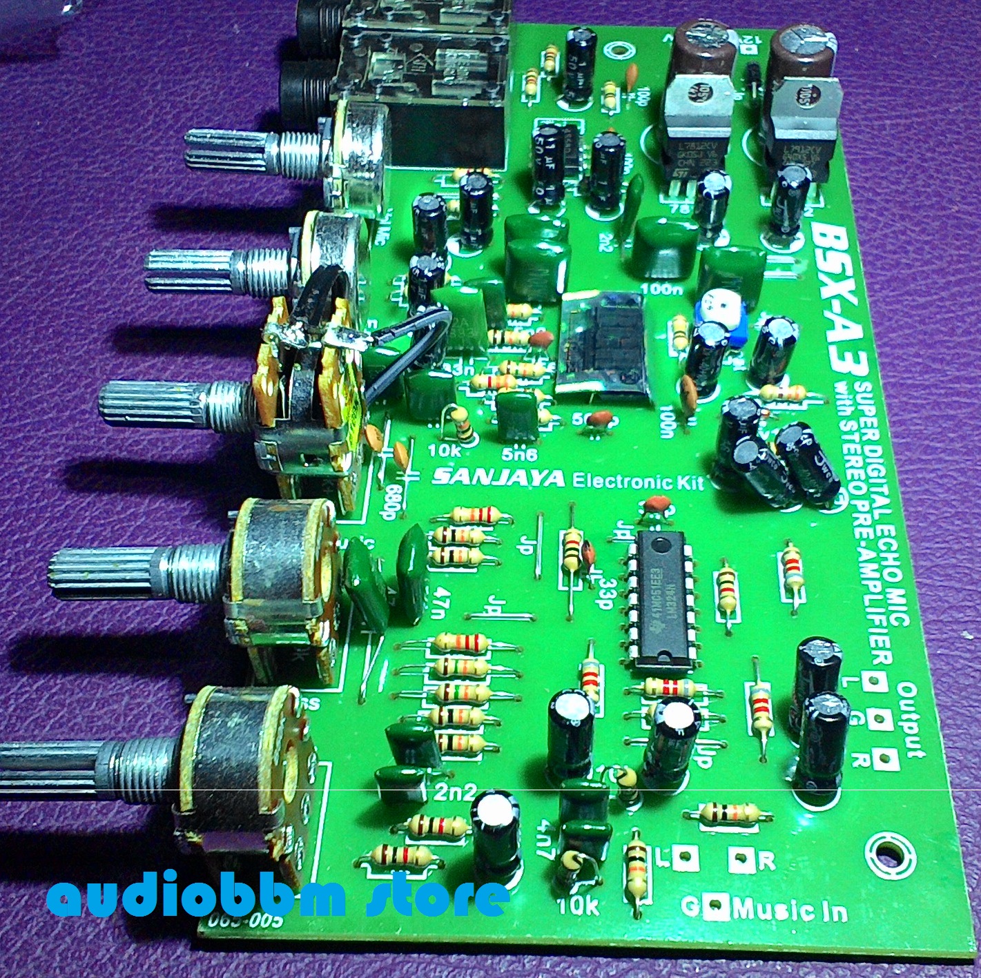 BSX A3 merupakan penguat mic yg dilengkapi dengan effect echo mixing dan terintegrasi dengan tone control Stereo, sehingga cocok untuk membuat amplifier karaoke murah meriah dirumah anda. Suara Vocal dari pre-amp mic yang dihasilkan cukup halus dan hangat, serta pengaturan nada bass/treble yang sangat baik . Terdiri dari 2 buah soket microphone, input music (DVD,CD,TV,Dll), pengaturan volume mic, echo, Vol Music, bass dan treble. Semua potensio pada kit ini menggunakan merk Alpha yang berkualitas baik.